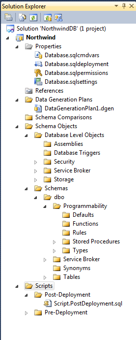 Database Object files are all the .sql files that create and maintain tables, stored procedures, indexes, etc. Below is a look on how they are organized by Visual Studio. I have not expanded every folder, but you should get a general sense of how .sql files are organized from this screenshot of solution explorer.